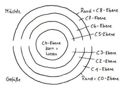 (die C0 steht in Resonanz mit der C8 - der Gegenwelt) C1 - unser physischer Körper (der Zellverband - unser Vitalkörper) (die C1 steht in Resonanz mit der C7 - den Kräften des Lichtes) C2 - die emotionale und energetische Dimension (der psychischer Körper - unser Emotionalkörper) (die C2 steht in Resonanz mit der C6 - den Archetypen) C3 - die mentale Dimension; Glaubenssätze; Ebene der Formkräfte/ Ähnlichkeitsregel, Denkschablonen (Matrix) etc. (unser Geist- oder Mentalkörper). (die C3 steht in Resonanz mit der C5 - dem Kollektivbewusstsein) C4 - die Dimension, die unser individuelles Wesen ausmacht; unsere spirituelle Dimension, unsere Seele (unser spiritueller Körper). Erst die individuelle Bewusstwerdung dieser C4-Ebene ermöglicht das bewusste Erleben/Erkennen der darüber liegenden (C5 bis C7) sowie der darunter liegenden (C1 bis C3) Ebenen! C5 - die kollektive Dimension (die gesamte Menschheit betreffend = der jeweilige aktuelle Bewusstseinszustand der Individuen;) Ist eine Art Kollektivmacht größerer Zusammenhänge. C6 - Herkunft der Archetypen, der Lebenskraft und der Zeit (das Periodensystem der Elemente, das astrologische System - Tierkreis, Planeten bzw. dessen Wirkkräfte…); Die Macht der Archetypen selber. C7 - die „Außenseite Gottes" (im Gegensatz zur Polarität als „Innenseite Gottes"); die Vorsehung, Ebene der Schöpferkräfte und des Lichtes (auch der Lichtgitter-Mandalas). Die Ursprungsmacht des Mythos. C8 - ist eine Gegenwelt, aus der unser Schicksal stammt. (die C8 ist sozusagen der Umschlag zur C0 - zur unbelebten Materie)
