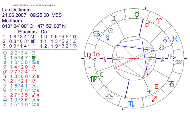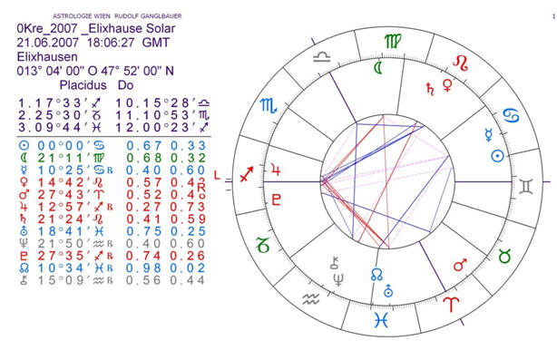 Astrologische Konstellationen zum Verlauf der C5-Verreibung Beginn der Verreibung (C1) am 21.06.2007 um 09:25 MES Ich habe für diesen Zeitpunkt ein MC mit 05°30´ Stier gewählt - dieses liegt auf dem Gruppenschicksalspunkt (GrpSchPkt) Merkur/Uranus; Die Anlage, der Aszendent liegt demnach auf 18°30´Löwe; und somit auf der Beziehungs-Achse Löwe/Wassermann die in den Halbsummen von Venus/Saturn und Chiron/Neptun liegt. Diese Anlage will also umgesetzt werden und zwar so, dass aufgrund des zur Verfügung stehenden Potenzials der Sonne (Sonne = Durchführung) das Ziel (= MC) erreicht wird. Die Venus ist jedoch gleichzeitig die Herrin von Stier und Waage. Diese will also aus dem Unbewussten (12. Haus) hervor gebracht werden – und befindet sich dann auch zum exakten Zeitpunkt der Sommersonnenwende im 8. Haus, also dem Haus der (bis dahin neu zu programmierenden) vorherrschenden Verhaltens-, Gedankens- und Glaubensmuster. Saturn im 1. Haus weist darauf hin, dass die mit Verreibungsbeginn im noch Unbewussten liegende Bestimmung (= Ziel/Spitze 10) der Venus im Realen (1. Haus/die pers. Anlage) neu strukturiert werden will (Saturn Opposition Neptun = die Hochwassermarke) – wobei bestehende Strukturen des Entgegenkommenden (Neptun im 7. Haus) niedergerissen bzw. aufgelöst werden müssen). Das 12. Haus ist das Haus des Neptuns und wird in diesem Fall vom Mond beherrscht (Spitze 12 / Krebs); Somit ist auch im Anlagenpotenzial Neptun in 7 und Chiron in 6 angesprochen. Chiron steht im 6. Haus (Aussteuerung der Lebensbedingungen – diese erfolgt nun durch die angesetzte C4-Verreibung) und in Verbindung sowohl mit Neptun (Konjunktion) als auch Venus (SpPkt). Der Deszendent mit Chiron und Neptun liegt im Zeichen Wassermann, der wiederum von Uranus beherrscht wird und mit dem Mondknoten im 8. Haus / Fische steht. Das 8. Haus wird aber von Neptun beherrscht (Spitze 8 in den Fischen) – Uranus in diesem Bereich verweist also auf die Unvereinbarkeit dieser beiden Planetenprinzipien (Uranus/Neuschöpfung von Formen; Neptun/Auflösung jeglicher Form) – Mondknoten in 8 = persönliche Beziehungen/Verbindungen zu den eigenen, aufzulösenden, einschränkenden Gedankenformen. Die Aussteuerung der Lebensbedingungen (die Wunde = Chiron) hat daher mit einem Schöpfungsakt (Uranus) zu erfolgen der das Freisetzen (Merkur SpPkt Uranus) von bisher vorprogrammierten und strukturierten Gefühlen (Mond in der Jungfrau im 2. Haus in Opposition zu Uranus und Mondknoten) zum Inhalt hat - wobei das Ergebnis dieses Schöpfungsaktes nur eine aufgelöste Struktur sein kann!