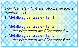 Diese drei Körper stellen also körperlich den Aufstieg zu Gott dar, der sich als Gegenbewegung zum Fall in die Inkarnation ab dem Kupfer zu ereignen hatte. Und auch, wenn hier von außen und innen gesprochen wird, müsst ihr euch gewahr sein, dass es sich bei dem gesamten Metallweg, was die Inkarnation als Ganze angeht, nur um die Innenseite der Inkarnation handelt ‑ also um den Seelenweg, den Weg des Wassers ‑ und nicht um die Außenseite des Weges ‑ den Weg der Erde, der hier in den Körpern Ausformung findet. Dieser Weg wurde in den Erdkräften als Gefäß bereitgestellt und steht diesem Metallweg sozusagen gegenüber. Die Seele ist gespiegelt worden, sie gehört nicht eigentlich in diese Welt, sie wird erst dort hineingespiegelt, sie geht hinein in die Erde, in diese Welt ‑ so wie der Geist in die Seele geht und nicht zu ihr gehört ‑ und darum steht die Erde am Anfang dieser großen Reise.[2] Der Emotionalkörper ist also der tiefste Punkt, den die Seele in der Inkarnation erreichen kann, er ist ihr neues Gefäß ‑ dort drin ist sie aufgehoben und gefangen! Innerhalb dieses Körpers, unterhalb der Wasseroberfläche muss sie nun den Weg zum Gold antreten, der stets als Vision ihr in den untersonnigen Prozessen vorschwebt. Es ist der Weg, der als Gesetz im Blei beschrieben wurde, wo das Leitbild (das Sonnenhafte) bis zur Unterseite des Erdenweges linksseitig hinübergebracht wurde, um schließlich nach den Gesetzen von Zeit, Zyklus und Karma ‑ welche rechtsläufig, also "recht'' waren ‑ zusammenzutreffen. Dieser Gesetzesweg wird nun in einer inneren Dynamik im Silber genauestens erlebt, er wird durchlebt. Das Blei schafft also die formal‑rechtliche Struktur, in der Zeit, Zyklus und Karma in ihrer Form abzulaufen haben ‑ er ist von außen wirksam, als oberster, äußerer obersonniger Prozess, fern vom Meer. Das Silber ist nun der unterste, letzte untersonnige Prozess, der diesen Verlauf genau durchlebt, also aus der Perspektive, wie er gemeistert werden muss. Er zeigt die subjektive Seite des Prozesses, während Blei die objektive Seite des Prozesses wiedergibt. Das ist ja die wirklich paradoxe Situation für euch, dass einerseits betrachtet, alles vorherbestimmt ist, ihr allem genau so begegnet, wie es vorher festlag, ihr keiner Situation entkommt (Saturnseite), andererseits ihr aber alles meistern müsst, ihr euren Weg selbst bestimmt und immer wieder Entscheidungen treffen müßt (Mondseite). Erst im Gold werdet ihr dieses Paradox aufzulösen suchen, da es ja die dritte Perspektive enthält, die weder subjektiv noch objektiv (also von oben aus gesehen) ist. Dort geht es um den Weg in das Jenseits dieser Polaritäten, dieser ewigen Dualität, die euch verrückt macht. Aber der Weg zum Meer schafft eben dieses Szenario in der diese paradoxe Polarität durch die Dualität von Außen und Innen gebildet wird und aus der heraus Bewegung entsteht. Weder in der Innenseite Gottes (dem Meer), noch in der Außenseite Gottes (der Sonne), gibt es diese Polarität bzw. Dualität selbst ‑ beide sind jenseits davon. Aber, indem ihr euch in die Innenseite Gottes wagtet, seid ihr nun zerrissen davon ‑ ihr lebt in der Welt der Spaltung, der Trennung, die eben in der Trennung von Gott ihren Ausdruck findet. Dieses alles bedeutet letztlich, dass ihr auch schon im Silber die Chance der Befreiung, der Lösung angedeutet bekommt, indem dieses schließlich daraufhin zielt, euch zu dem zu führen, was außerhalb dieser paradoxen Polarität liegt Die letzten beiden Silberprozesse, die letzte Erhöhung des Silbers, werden daher euch zu diesen beiden Grundwahrheiten von Gott zurückführen ‑ als Abschluß dieser langen Reise der Seele, wo dann diese eigentlich unerträgliche Situation wieder aufgehoben wird und alles wieder dorthin zurückkehrt, wo es herkam und wo es eben hingehört. Ihr seid auf einer Odyssee, auf einer Irrfahrt. Das Silber zeigt euch, wie diese Odyssee verlaufen wird, wohin ihr gelangt, was euch begegnet. Erst dann gibt es die Rückkehr zu Gott ‑ den Goldprozess. Nun aber geht es ins Verdrängte, jedoch letztlich Unverdrängbare: euer zeitweise neues Zuhause, eure Trugheimat, in der ihr euch vormachen könnt, als seid ihr unverletzt, heil und strahlenhaft‑sonnig, die euch jedoch immer wieder erinnern wird, weshalb ihr hier seid und euch einführt in das Reich des Schreckens, des Verlustes, der Irrungen, des ewigen Werdens und Vergehens, in das Reich des Unterganges, dort, wo ihr euch alle verliert ‑ euch selbst, euren Bezug zur Sonne ‑, gefangen im Trug. Nach außen geht es für euch um das Licht, das in die Dunkelheit zu bringen ist ‑ so wie ihr in den Körper den Geist hineinzubringen habt und so in dieser Verkörperung und Konzentration auf die Erde schließlich Ergebenheit, d.h. Ehrfurcht und Demut zu lernen habt. Dies ist der Weg von Schwere (Erde) und Geist (Luft), den ihr zu vollziehen habt und der euch Bewusstheit schenkt. Nach innen geht es für euch um die Verletzung und das Heil daraus, welches in der Trennung von Gott entsteht und der sich in dem polaren Weg von Mond (Wasser) und Sonne (Feuer) ausdrückt. Darum ist der Mond der innere Angelpunkt eures Daseins hier. Und seine einzige Gnade heißt: Alles wird zu einem Ausgleich geführt, jeder Hybris[3] folgt Demut (Wasser‑ Erde‑ Polarität), jedem Leid folgt ein Heil, ein Geschenk (Wasser‑ Sonne‑ Polarität), nichts wird nur auf einer Seite bleiben ‑ die Summe ergibt die eigentliche Erkenntnis: Das Nichts ist.