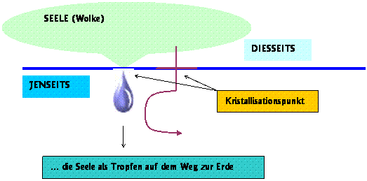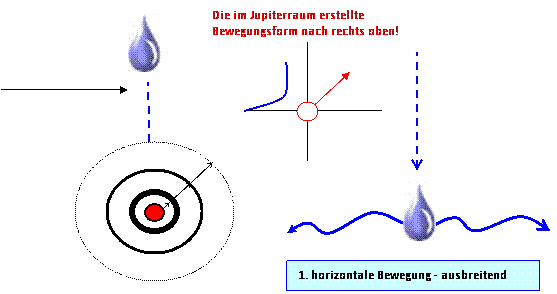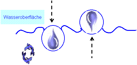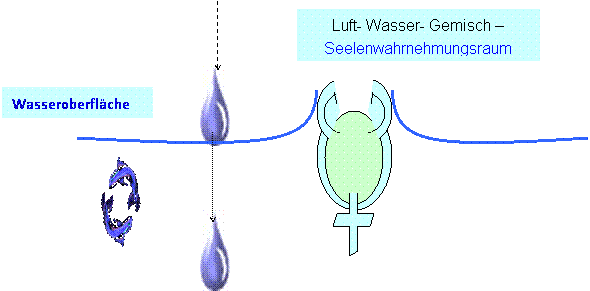 Der MerkurprozessDann kommt es zu einem abermals gegenläufigen Prozess ‑ jedoch hier nicht in der horizontalen Ebene, sondern in der vertikalen: Nach oben bildet dieser Einschlag mit seiner nun folgenden Dynamik einen neuen Spiegelraum, der dem Merkurprozess entspricht und ein Luft-Wassergemisch bildet und so der Seelenwahrnehmungsraum oberhalb der Wasseroberfläche wird, der der Seele ja fremd bleibt, die sich nun unter die Wasseroberfläche in den Mondraum begibt. |