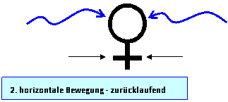 | Daher auch der notwendige Sprung zwischen Mars und Venus. Es ist also nicht nur die dem Symbol anhaftende eigene Dynamik, die in den untersonnigen Prozessen grundlegend sich wandelt und nach innen strebt, es ist auch der entgegengesetzte eigene Blick, der sich ergibt, wenn ihr eingetaucht seid und nun das Ganze von unten aus betrachten müsst. Schon die Kupferringe, die wieder zum Zentrum zurückstreben, sind von unten aus betrachtet ‑ obwohl es bei ihnen nicht der Tropfen selbst, sondern die Umgebung des Wassers ist, das hier in die Dynamik eingeht und von der Seele gespürt werden kann. |