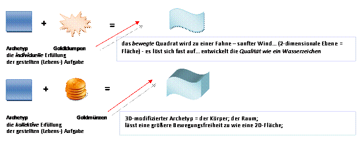 d.h. die Archetypen zwar in ihrer Konsequenz zu belassen – Quadrat bleibt Quadrat!, aber dieses in einer Bewegung, die zulässt, dass das Kollektiv liebevoll das Individuum entlastet!