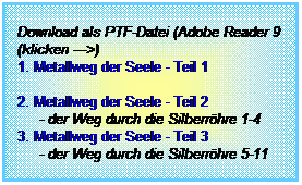 Diese drei Körper stellen also körperlich den Aufstieg zu Gott dar, der sich als Gegenbewegung zum Fall in die Inkarnation ab dem Kupfer zu ereignen hatte. Und auch, wenn hier von außen und innen gesprochen wird, müsst ihr euch gewahr sein, dass es sich bei dem gesamten Metallweg, was die Inkarnation als Ganze angeht, nur um die Innenseite der Inkarnation handelt ‑ also um den Seelenweg, den Weg des Wassers ‑ und nicht um die Außenseite des Weges ‑ den Weg der Erde, der hier in den Körpern Ausformung findet. Dieser Weg wurde in den Erdkräften als Gefäß bereitgestellt und steht diesem Metallweg sozusagen gegenüber. Die Seele ist gespiegelt worden, sie gehört nicht eigentlich in diese Welt, sie wird erst dort hineingespiegelt, sie geht hinein in die Erde, in diese Welt ‑ so wie der Geist in die Seele geht und nicht zu ihr gehört ‑ und darum steht die Erde am Anfang dieser großen Reise.[2] Der Emotionalkörper ist also der tiefste Punkt, den die Seele in der Inkarnation erreichen kann, er ist ihr neues Gefäß ‑ dort drin ist sie aufgehoben und gefangen! Innerhalb dieses Körpers, unterhalb der Wasseroberfläche muss sie nun den Weg zum Gold antreten, der stets als Vision ihr in den untersonnigen Prozessen vorschwebt. Es ist der Weg, der als Gesetz im Blei beschrieben wurde, wo das Leitbild (das Sonnenhafte) bis zur Unterseite des Erdenweges linksseitig hinübergebracht wurde, um schließlich nach den Gesetzen von Zeit, Zyklus und Karma ‑ welche rechtsläufig, also "recht'' waren ‑ zusammenzutreffen. Dieser Gesetzesweg wird nun in einer inneren Dynamik im Silber genauestens erlebt, er wird durchlebt. Das Blei schafft also die formal‑rechtliche Struktur, in der Zeit, Zyklus und Karma in ihrer Form abzulaufen haben ‑ er ist von außen wirksam, als oberster, äußerer obersonniger Prozess, fern vom Meer. Das Silber ist nun der unterste, letzte untersonnige Prozess, der diesen Verlauf genau durchlebt, also aus der Perspektive, wie er gemeistert werden muss. Er zeigt die subjektive Seite des Prozesses, während Blei die objektive Seite des Prozesses wiedergibt. Das ist ja die wirklich paradoxe Situation für euch, dass einerseits betrachtet, alles vorherbestimmt ist, ihr allem genau so begegnet, wie es vorher festlag, ihr keiner Situation entkommt (Saturnseite), andererseits ihr aber alles meistern müsst, ihr euren Weg selbst bestimmt und immer wieder Entscheidungen treffen müßt (Mondseite). Erst im Gold werdet ihr dieses Paradox aufzulösen suchen, da es ja die dritte Perspektive enthält, die weder subjektiv noch objektiv (also von oben aus gesehen) ist. Dort geht es um den Weg in das Jenseits dieser Polaritäten, dieser ewigen Dualität, die euch verrückt macht. Aber der Weg zum Meer schafft eben dieses Szenario in der diese paradoxe Polarität durch die Dualität von Außen und Innen gebildet wird und aus der heraus Bewegung entsteht. Weder in der Innenseite Gottes (dem Meer), noch in der Außenseite Gottes (der Sonne), gibt es diese Polarität bzw. Dualität selbst ‑ beide sind jenseits davon. Aber, indem ihr euch in die Innenseite Gottes wagtet, seid ihr nun zerrissen davon ‑ ihr lebt in der Welt der Spaltung, der Trennung, die eben in der Trennung von Gott ihren Ausdruck findet. Dieses alles bedeutet letztlich, dass ihr auch schon im Silber die Chance der Befreiung, der Lösung angedeutet bekommt, indem dieses schließlich daraufhin zielt, euch zu dem zu führen, was außerhalb dieser paradoxen Polarität liegt Die letzten beiden Silberprozesse, die letzte Erhöhung des Silbers, werden daher euch zu diesen beiden Grundwahrheiten von Gott zurückführen ‑ als Abschluß dieser langen Reise der Seele, wo dann diese eigentlich unerträgliche Situation wieder aufgehoben wird und alles wieder dorthin zurückkehrt, wo es herkam und wo es eben hingehört. Ihr seid auf einer Odyssee, auf einer Irrfahrt. Das Silber zeigt euch, wie diese Odyssee verlaufen wird, wohin ihr gelangt, was euch begegnet. Erst dann gibt es die Rückkehr zu Gott ‑ den Goldprozess. Nun aber geht es ins Verdrängte, jedoch letztlich Unverdrängbare: euer zeitweise neues Zuhause, eure Trugheimat, in der ihr euch vormachen könnt, als seid ihr unverletzt, heil und strahlenhaft‑sonnig, die euch jedoch immer wieder erinnern wird, weshalb ihr hier seid und euch einführt in das Reich des Schreckens, des Verlustes, der Irrungen, des ewigen Werdens und Vergehens, in das Reich des Unterganges, dort, wo ihr euch alle verliert ‑ euch selbst, euren Bezug zur Sonne ‑, gefangen im Trug. Nach außen geht es für euch um das Licht, das in die Dunkelheit zu bringen ist ‑ so wie ihr in den Körper den Geist hineinzubringen habt und so in dieser Verkörperung und Konzentration auf die Erde schließlich Ergebenheit, d.h. Ehrfurcht und Demut zu lernen habt. Dies ist der Weg von Schwere (Erde) und Geist (Luft), den ihr zu vollziehen habt und der euch Bewusstheit schenkt. Nach innen geht es für euch um die Verletzung und das Heil daraus, welches in der Trennung von Gott entsteht und der sich in dem polaren Weg von Mond (Wasser) und Sonne (Feuer) ausdrückt. Darum ist der Mond der innere Angelpunkt eures Daseins hier. Und seine einzige Gnade heißt: Alles wird zu einem Ausgleich geführt, jeder Hybris[3] folgt Demut (Wasser‑ Erde‑ Polarität), jedem Leid folgt ein Heil, ein Geschenk (Wasser‑ Sonne‑ Polarität), nichts wird nur auf einer Seite bleiben ‑ die Summe ergibt die eigentliche Erkenntnis: Das Nichts ist.