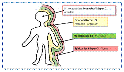 So erkennt ihr noch deutlicher, wie Merkur eine Spiegelung der Spiegelung ist und den Blick imitiert, der sich in den obersonnigen Prozessen zum Meer dargestellt hat und so die "männliche" Sichtweise ergibt, die wie von außen geschieht. Darum nennt ihr diese Betrachtung auch die reflektierende. Diese Rückspiegelung ist notwendig, da der Blick von außen sonst nicht mehr herstellbar wäre, da ihr es ja seid, die diesen Blick haben ‑ er also immer ein wahrnehmender, untersonniger sein muss, denn ihr seid ja nun hineingegangen ins Meer und von dort aus spielt sich euer Leben ab. Um euch von außen zu betrachten, braucht ihr daher die doppelte Spiegelung des Merkurs, der euch die Möglichkeit des anderen, polaren Blickes gibt, wie wenn ihr außer euch wäret. Damit ergibt sich noch ein weiteres Phänomen: Die drei untersonnigen Prozesse haben notwendigerweise etwas geschaffen, in dem sie sich aufhalten müssen, damit diese wahrnehmende Qualität überhaupt möglich ist. D.h., obwohl ihr durch sie hindurchgegangen seid und euch nun im Silberprozess befindet, ist euch von den untersonnigen Prozessen notwendig etwas geblieben, damit diese Art der Wahrnehmungsmöglichkeit weiterhin innerhalb eurer Inkarnation ablaufen kann. Hier tritt das schon erwähnte Gesetz wieder in Kraft, dass sich der Inhalt eine Form schaffen muss, um sich zu realisieren, und dass er zuerst da sein muss und die Form ihm folgt[1]. Diese Form nun sind drei verschiedene Körper, die sich in diesen drei Prozessen gebildet haben und den Weg nach oben, d.h. in umgekehrter Richtung der untersonnigen Einweihungsorte darstellen und so auf den Goldprozess hinweisen, der ja in seiner ersten Form zwischen dem Eisen und dem Kupfer abläuft. Diese drei Körper umgeben euch und wir nennen sie, nun vom Silber ausgehend bis hin zum Kupfer: den Emotionalkörper, den Mentalkörper und den spirituellen Körper. Alle drei Körper tragen diesen Metallprozessen gemäß verschiedene Qualitäten ‑ also: wertend; reflektierend und schließlich wertfrei hingebend/erleuchtend/sonnenhaft seiend. Entsprechend werden diese drei Körper von den besprochenen Arzneimitteln unterschiedlich angesprochen. Sie legen sich wie Schichten um euren Leib: |