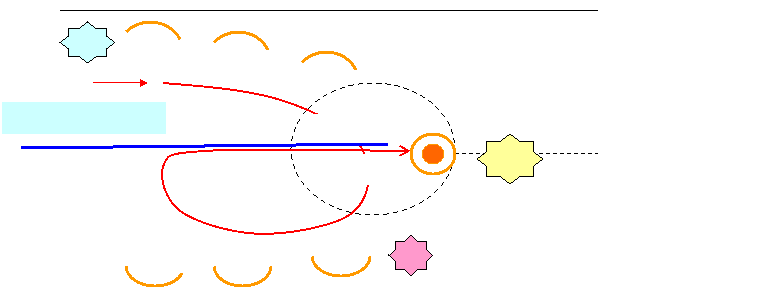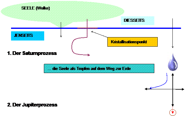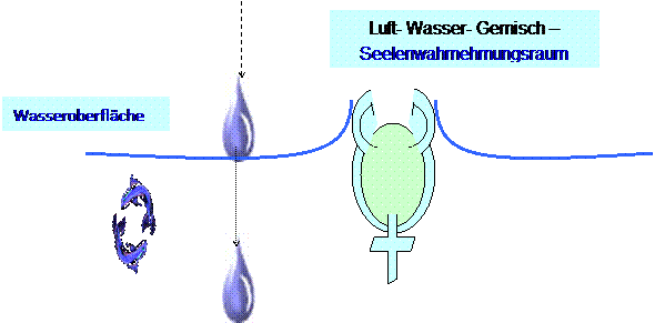 Der MerkurprozessDann kommt es zu einem abermals gegenläufigen Prozess ‑ jedoch hier nicht in der horizontalen Ebene, sondern in der vertikalen: Nach oben bildet dieser Einschlag mit seiner nun folgenden Dynamik einen neuen Spiegelraum, der dem Merkurprozess entspricht und ein Luft-Wassergemisch bildet und so der Seelenwahrnehmungsraum oberhalb der Wasseroberfläche wird, der der Seele ja fremd bleibt, die sich nun unter die Wasseroberfläche in den Mondraum begibt. |
