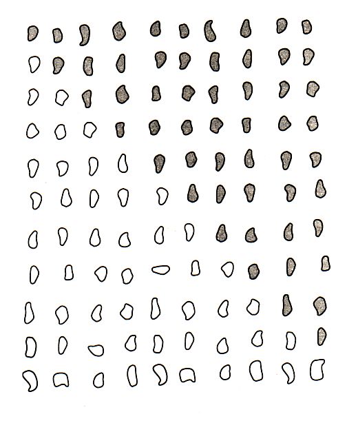 Statt das Problem mit großem Aufwand direkt anzugehen, hatte Gauß sich einen kleinen Umweg überlegt. Er dachte sich, dass man die Anzahl der Bohnen in einem Dreieck mit 100 Reihen am leichtesten erhält, wenn man ein zweites, ähnliches Dreieck von Bohnen andersherum neben das erste Dreieck legt. Nun erhält man ein Rechteck mit 101 Reihen, von denen jede 100 Bohnen enthält. Die Anzahl der Bohnen in diesem aus zwei Dreiecken zusammengesetzten Rechteck zu berechnen war leicht: Es gibt insgesamt 101 x 100 = 10.100 Bohnen. Also muss die Anzahl der Bohnen in einem Dreieck grade die Hälfte davon sein, nämlich 1/2 x 101 x 100 = 5050.